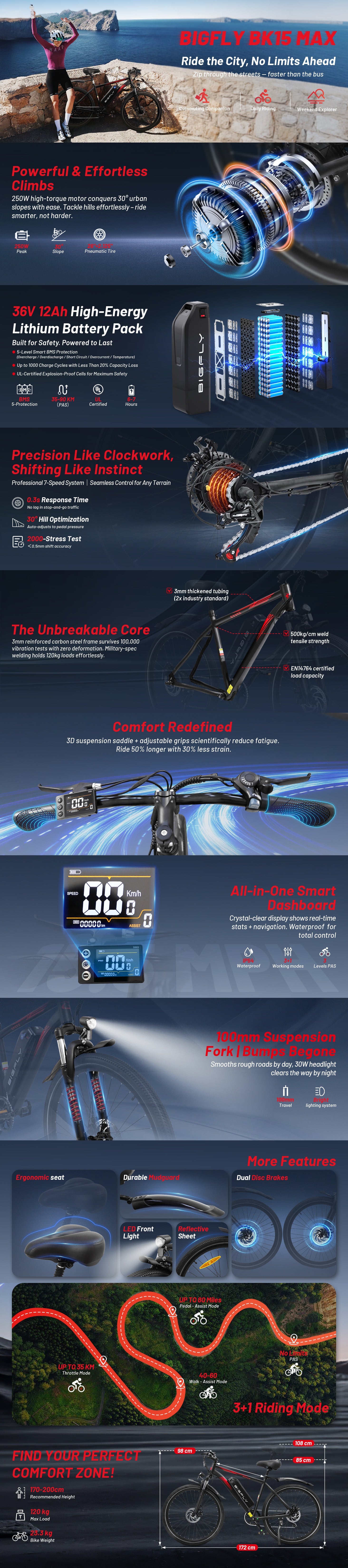 Bigfly BK15 Max 250w Rear Drive Motor 36V 12Ah Battery Mountain Off-Road Electric Bike