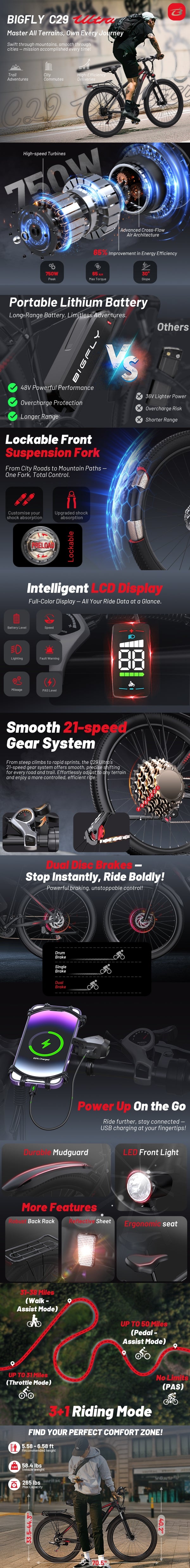 Bigfly C29 Ultra features a 750W rear-drive brushless motor, 48V 15AH lithium battery, and a lightweight aluminum alloy frame. With a max speed of 50km/h, 29-inch wheels, and hydraulic disc brakes, it delivers high performance for mountain and off-road adventures.